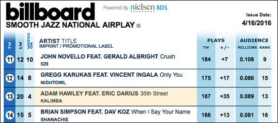 Adam’s latest single “Traveling Mood” featuring Julian Vaughn is #1 for a third straight week on Billboard and #1 on Allen Kepler’s Smooth Jazz Top 20. Congrats Adam!